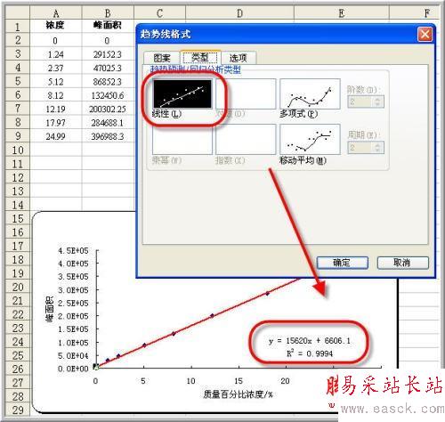 在數據點上單擊右鍵,選擇“添加趨勢線”-“線性”,并在選項標簽中要求給出公式和相關系數等,可以得到擬合的直線。