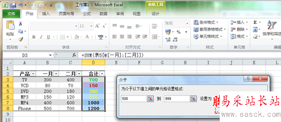 再次單擊“條件格式”,移動鼠標到顯示的下拉菜單“突出顯示單元格規則”上,在展開的菜單中單擊“介于”命令,在彈出的對話框中輸入值“500”到“999”,設置為“自定義格式”,并在彈出的對話框中的“顏色”中選擇綠色。