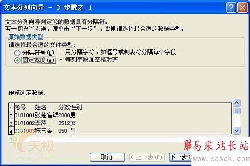 3.在打開的“文本分列向導”對話框中,根據基本數據的特點,選擇“固定寬度”。如圖4。