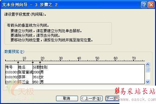 4.單擊“下一步”,設置字段寬度。單擊建立分列線,按住左鍵可拖動分列線的位置,雙擊可取消分列線。如圖5。