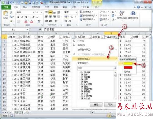 2、單擊“產品名稱”列上的篩選按鈕,選擇“按顏色篩選”,并挑選顏色,例如“黃色”。