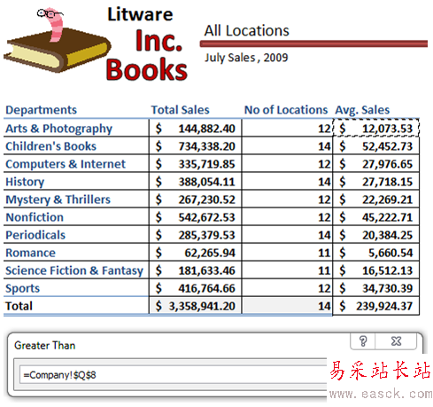 最后一個工作表包含全公司累計銷售數據,使用每個部門的平均值。