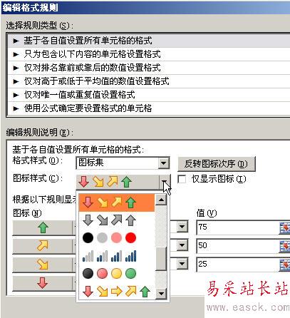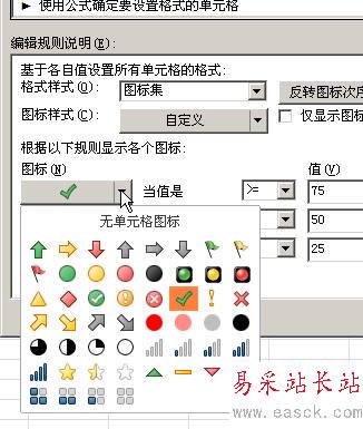 設置的方法是在“編輯格式規則”對話框中,單擊相應規則左側的按鈕旁的下拉箭頭選擇某個圖標,如果選擇“無單元格圖標”則會隱藏單元格圖標。