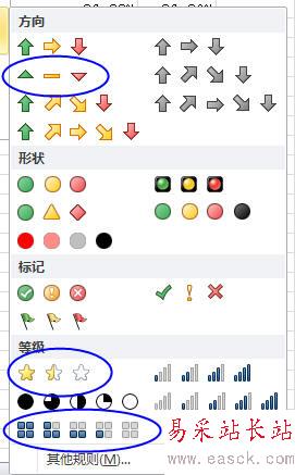 Excel 2007中的圖標集有17中圖標樣式,Excel 2010又新增的3種圖標樣式,分別是“3個三角形”、“3個等級”和“5個框”。并且進一步細分了類別,如“方向”、“形狀”、“標記”等。