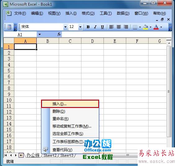 2、如要插入“工作表”任意點(diǎn)擊一個(gè)“標(biāo)簽”如“辦公族”右鍵“插入”。