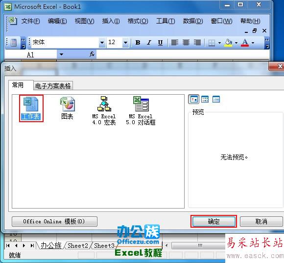 3、此時(shí)彈出“插入”對(duì)象欄選擇“常用”欄內(nèi)的“工作表”接著按“確定”即可。
