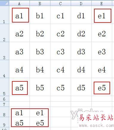 如圖2所示,按Ctrl鍵后同時(shí)選中a1、e1、a5、e5四個(gè)單元格,復(fù)制后粘貼會(huì)發(fā)現(xiàn)復(fù)制的內(nèi)容連接到了一起。這樣可以達(dá)到快速?gòu)?fù)制不連接單元格的作用。當(dāng)然如果中間有空白單元格則是無(wú)法選中的。