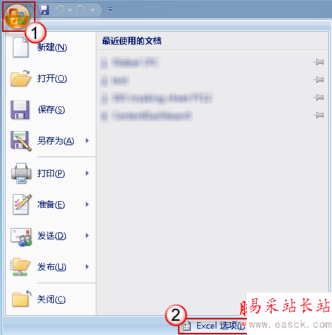 在 Excel 2007 中,按一下左上角的 Office 按鈕,然后單擊“Excel 選項”。