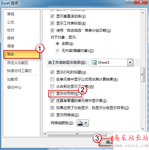 在“選項”窗口左側(cè)單擊“高級”,然后從右側(cè)窗口中找到“顯示分頁符”復(fù)選框,清除復(fù)選框前的勾選。