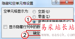 在打開的設(shè)置對話框中為空單元格的顯示進行設(shè)置。默認情況下選擇的是“空距”,我們可以將其改為“用直線連接數(shù)據(jù)點”。