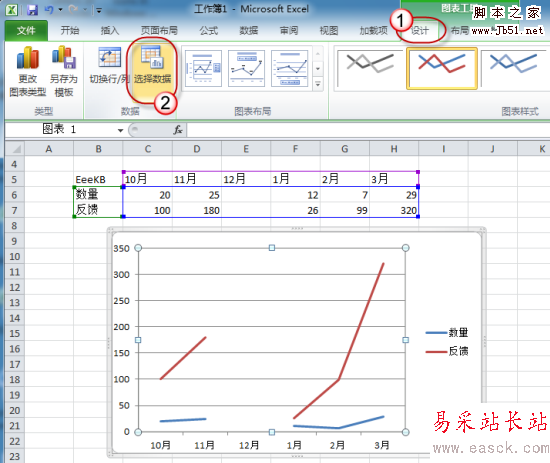 首先單擊圖表將其選中,在圖表工具“設(shè)計”選項卡的“數(shù)據(jù)”選項組中單擊“選擇數(shù)據(jù)”按鈕。