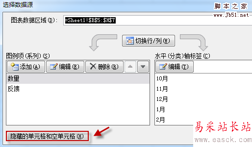 在隨后彈出的對話框中單擊“隱藏的單元格和空單元格”按鈕。