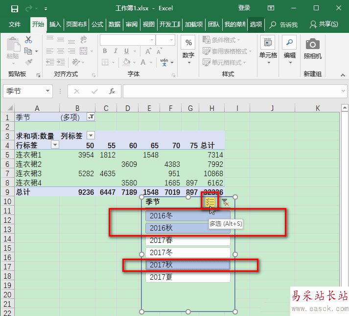 5、默認是單選,點擊了“多選”按鈕之后,可以同時選擇多個季節(jié)下數(shù)據(jù)匯總。點擊漏斗加叉號按鈕,可以取消篩選,恢復默認的全選狀態(tài)。