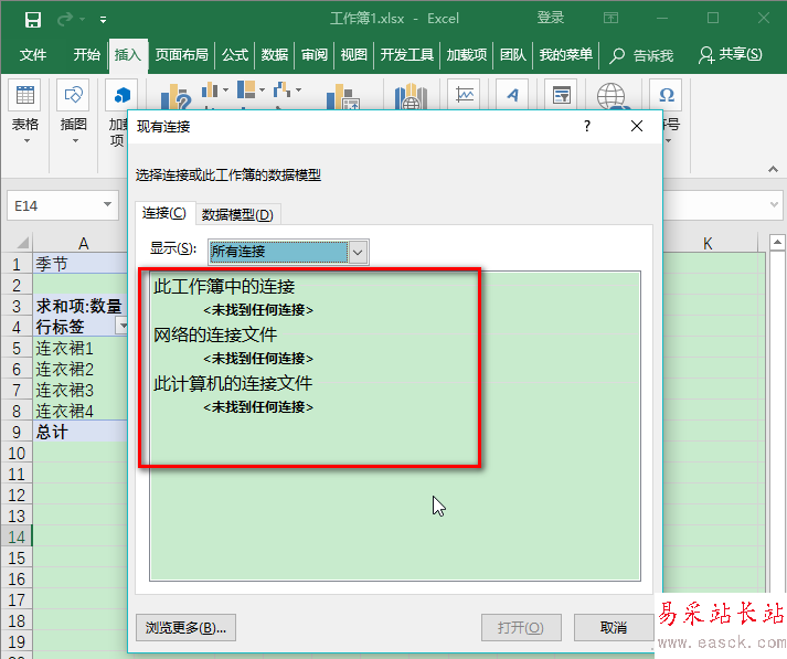 2、發(fā)現(xiàn)切片器沒有選項,只有“未找到任何連接”錯誤提示。細心的朋友就會發(fā)現(xiàn)上圖中的鼠標沒有選中數(shù)據(jù)透視表中的任何數(shù)據(jù),因此就出現(xiàn)了“未找到任何連接”錯誤。