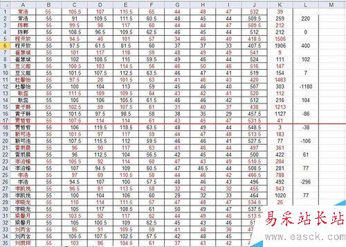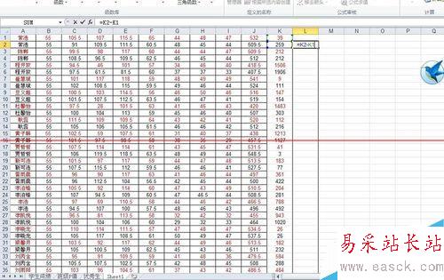 4、就得到了如圖,現(xiàn)在我們知道了紅字是這期中,黑字是上期末,也就是說,黑字減去紅字如果是正數(shù),就代表這個(gè)學(xué)生進(jìn)步,反之,則為退步。所以我們?cè)?ldquo;L”列....算了,我解釋不了,看圖吧。