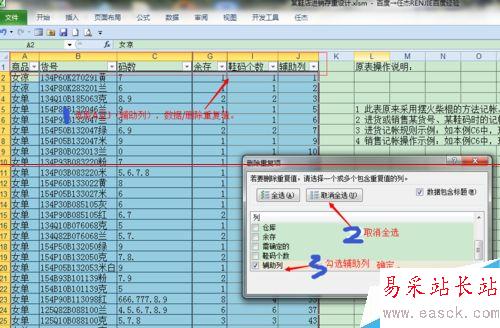 1、刪除重復項:將上面公式計算出的數據,復制粘貼為數值。選取A到J列,依次點擊數據/刪除重復項,取消全選。然后勾選“刪除重復項”對話框下面“列”中的“輔助列”,確定。