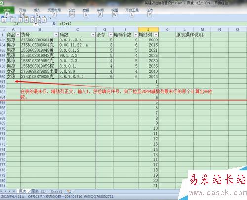 2、利用輔助列:在J1中輸入標題“輔助列”。在J2中輸入1,在J3中輸入公式=J2+I2。然后右擊單元格右下角的小黑十字,或向下填充公式到有數據(貨號列)的最后一行。