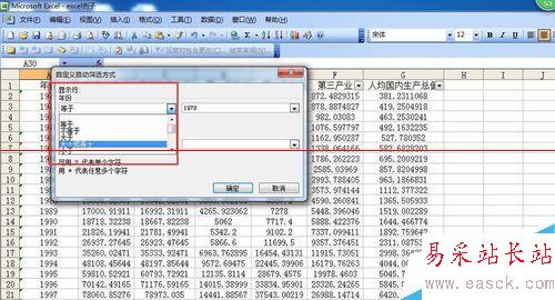 5、此時,會彈出一個“自定義自動篩選方式”的對話框,根據自己需要填寫內容,如小編想要篩選出年份為1978年的GDP數據,就選擇年份“等于”——“1978”,如果想選擇1978年后的,可選擇“大于”
