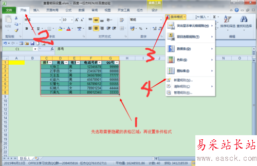 選取需要限制查看的表格區(qū)域(本例是工作表聯(lián)系人!C1:G8區(qū)域),依次點(diǎn)擊:開(kāi)始/條件格式/新建規(guī)則;