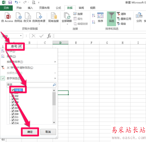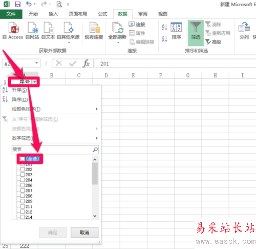 7、刪除空白行后需要恢復之前的數據行。點擊下三角標志,然后勾選“全選”,這樣下面所有的數據都篩選上,點擊“確定”。