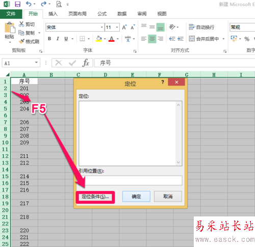 2、點擊鍵盤上“F5”鍵,彈出“定位”框,單擊最下方的“定位條件”。