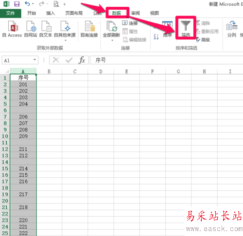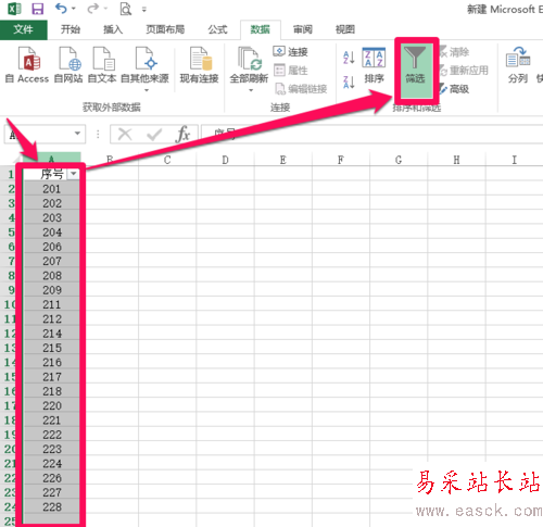 3、選中第一列時,然后點擊“數據”—“篩選”,對第一列進行篩選處理。
