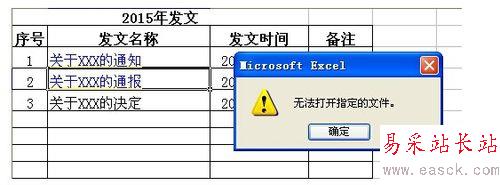 當把“2015年收發文”excel表格移到其他位置,便會出現“無法打開指定文件”的提示