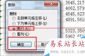 2、彈出“刪除”對話框,單擊“整行”單選按鈕,單擊“確定”后就可以刪除單元格所在的行。