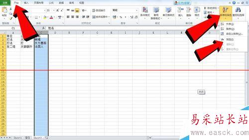 3、在EXCEL 頂端的菜單欄中,選擇“開始”,在最右邊,選擇“排序和篩選”,在下拉菜單中,選擇“篩選”。