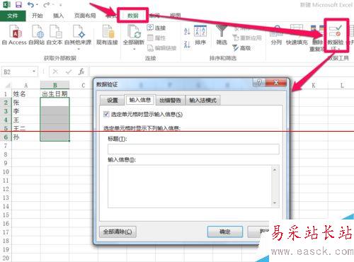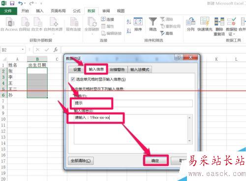 EXCEL 2013是一款在各行各業廣泛應用的統計軟件。用EXCEL做統計時,統一格式是一件很麻煩的事,例如填寫出生日期時,有人寫成1989年11月7日,有人寫成1989-11-7。如果在填寫相應的單元格時彈出提示,提示用統一的格式。最后匯總統計時就會省去很多不必要的麻煩。今天小編就和大家分享下如何設置使在單元格輸入時彈出提示信息。
