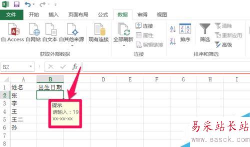 5、點擊單元格,會彈出提示框“提示:請輸入19xx-xx-xx”,設置成功。
