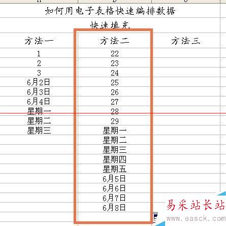 4、拖動至要填充的單元格后,放開鼠標,可看到被拖過的部分均自動填充了數據。其他類型的數據也可如此進行,在此不分步示范。