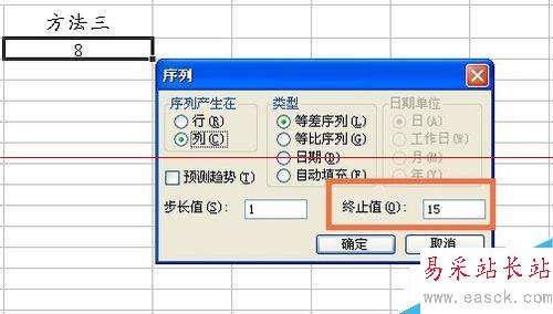 3、在彈出的“序列”提示框中對要填充的數據進行設置,可設置“終止值”,點擊確定。
