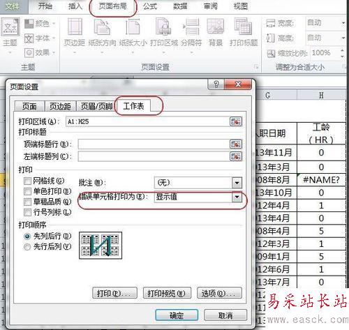 5、避免打印錯誤,如果您的工作表存在錯誤,可以采取下面的措施避免它們被打?。簡螕?ldquo;文件”菜單中的“頁面設置”命令,打開對話框中的“工作表”選項卡。再打開“錯誤單元格打印為”下拉列表,根據需要選擇“<空白>”或“--”即可。