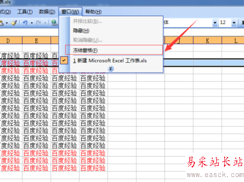 5、彈出一個下拉的菜單中選中”凍結窗口“的選項,這樣的標題的窗口就被凍結了。