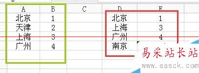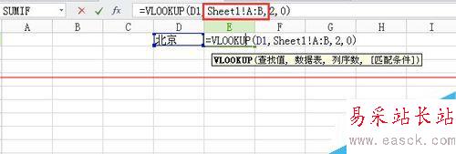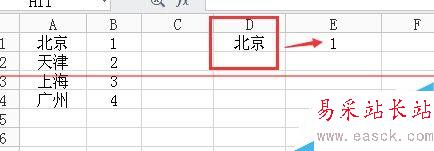 2、如圖,如在D1單元格輸入“北京”,將在E1單元格輸出“1”,在E1單元格輸入公式E1=VLOOKUP(D1,A:B,2,0)