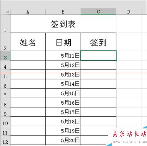 1、打開簽到表,可以看到有三列內容,分別是“姓名”、“日期”、“簽到”。要在簽到一欄中輸入"√"和"×",代表已經簽到和未簽到。