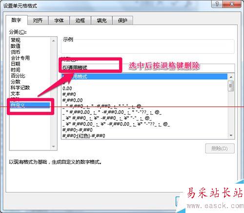 5、選擇“自定義”,在右側的類型中選中“通用格式”并按退格鍵刪除。