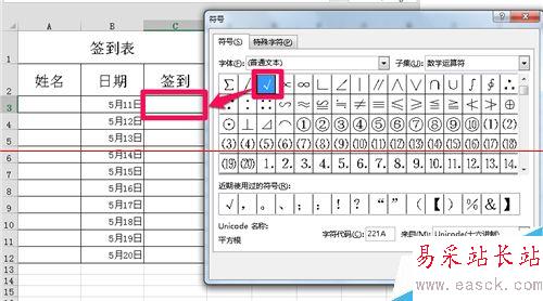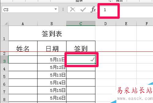 7、返回excel界面,在單元格中輸入“1”,回車后,就可以看到簽到欄中已經輸入了"√"。