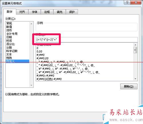 6、然后在類型中輸入:[=1]"√";[=2]"×" 。里面的"√"和"×",可以先在單元格中按插入的方法得到,再粘貼到自定義格式框中。