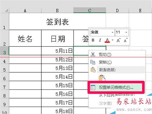 3、一個一勞永逸的方法是:在“簽到”列中某一單元格右擊鼠標,在彈出的快捷菜單中選擇“設置單元格格式”。