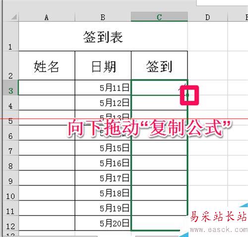 8、接下來,還需要把這個設置復制到似有的“簽到”列的單元格中,單擊已經設置好格式的單元格,在單元格的右下角出現小方塊,拖動鼠標左鍵向下,將格式復制到全部"簽到“列中。現在就大功告成了。