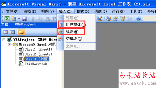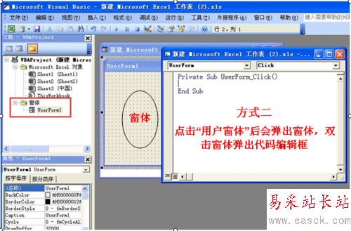 (說明一下:方式一打開的窗體沒有默認對象,程序編寫時如果要處理工作表或工作簿的數據,必須指明對象,如:對sheet2工作表的單元格進行處理,那么這樣寫sheet2.cells或sheets(2).cells;方式二和方式一打開的一樣,需要指明程序處理的對象;方式三打開的代碼框是默認的,也可以重新指定對象,如:雙擊sheet1工作表,那么在對應的代碼框中如果不指定對象,默認對應的是sheet1工作表。)