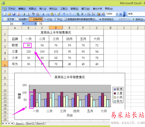 5、表格中數據的更改,圖表也隨之更改。我們可以試一下,把聯想一月份的銷量改為80,來看一下,圖表也隨之改成了80。這說明,圖表和表格之間是完全對應的。