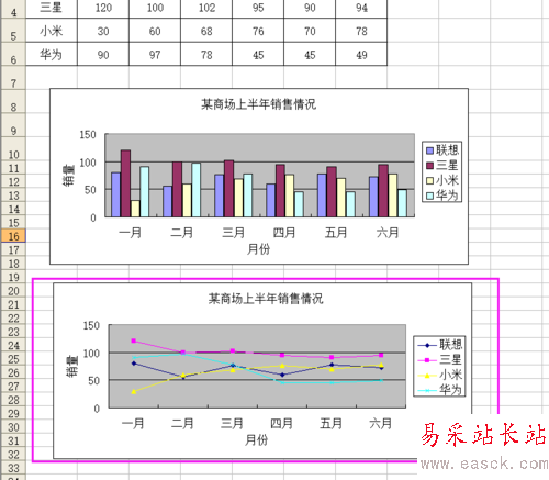6、依上述方法可制作出折線圖表、餅形圖表等各種各樣的圖表。如圖為折線圖表: