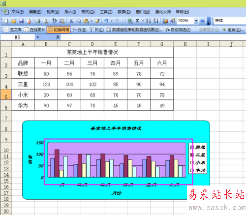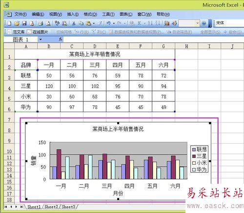 1、首先在我們制作出我們需要的表格,第一步選中數據,不要選擇“某商場上半年銷售情況“這一單元格,因為它是已經合并了的。