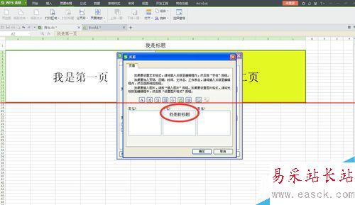 5、進入自定義頁眉中,標題按左、中、右劃分,一般標題居中,此處小編以居中為例。新標題為“我是新標題”,標題可在此頁面設置字體等。