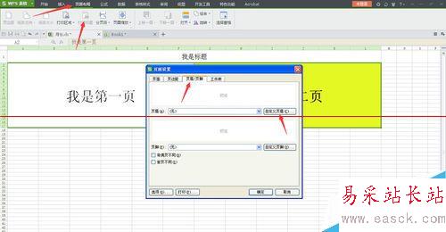 4、設置完成后,再次預覽,此時,會沒有標題。再次選擇:頁面布局—打印標題——頁面/頁眉—自定義頁眉