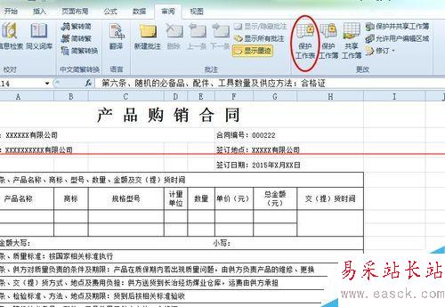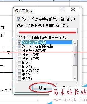 9、點擊“保護工作表”。在這里可以輸入文檔保護密碼,然后確定。這時,表格中除了剛才選定的區域,均已被鎖定無法編輯了。