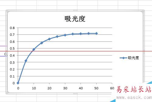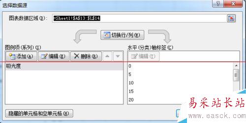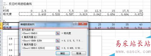 7、在“系列名稱”中選擇數(shù)據(jù)名稱,此圖為“吸光度”;“X軸系列值”和“Y軸系列值”中分別選擇需添加制作的數(shù)據(jù)。設(shè)置圖如下所示。